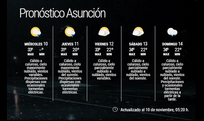 El día de hoy se presenta inestable a nivel país, en el norte y este de la Región Oriental, como así también en el centro y oeste del Chaco zonas donde las lluvias serían más generalizadas y acompañadas de tormentas eléctricas puntualmente intensas, indicó inicialmente la meteoróloga Violeta González, de la Dirección de Meteorología e Hidrología.
